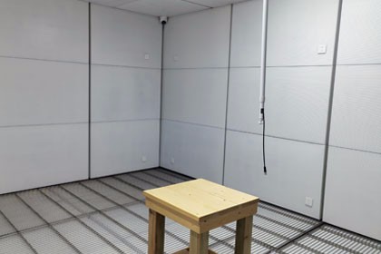 消声室所用的吸声材料,要求吸声系数大于0.99。一般使用渐变吸收层,常用尖劈或圆锥结构,以玻璃棉作吸声材料,也有用软泡沫塑料的。例如一个10×10×10m的实验室,每面敷设1m长的吸声尖劈,其低频截止频率可达50Hz。在消声室中进行试验时,被测试的对象或声源等置于中 央的尼龙丝网或钢丝网上,由于此类网能承受的重量有限,故只能测试重量轻、体积小的声源等。